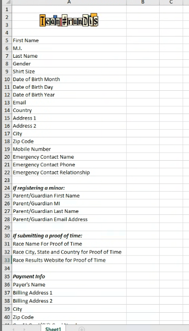 No payment or credit card information is transmitted through this form. This is a local Excel file, stored on your computer for personal use, to help you prepare your registration day info.